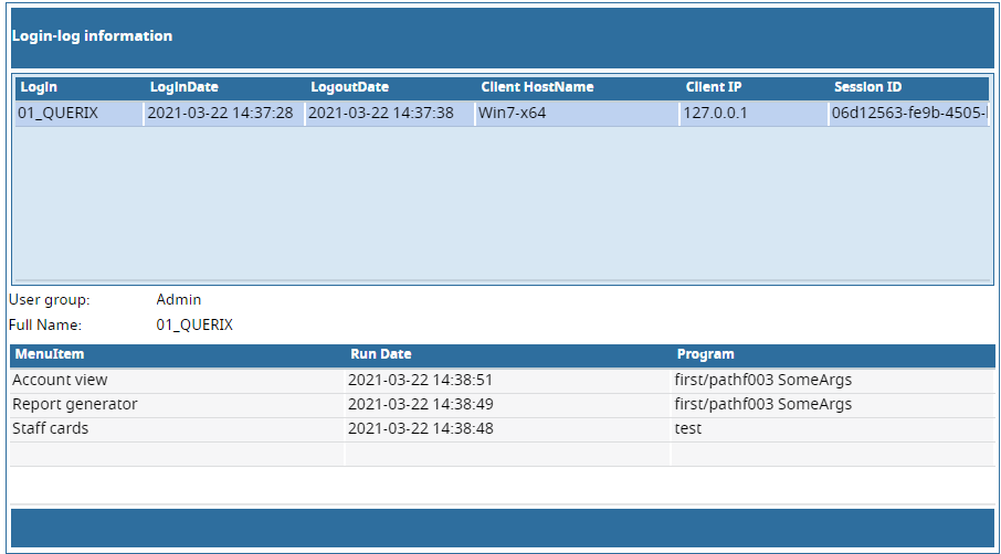 Run the qxt_demo_menu application and log in with one of the existing users. Default users 01_QUERIX, 02_QUERIX and 03_QUERIX have different menus and belong to different user groups.