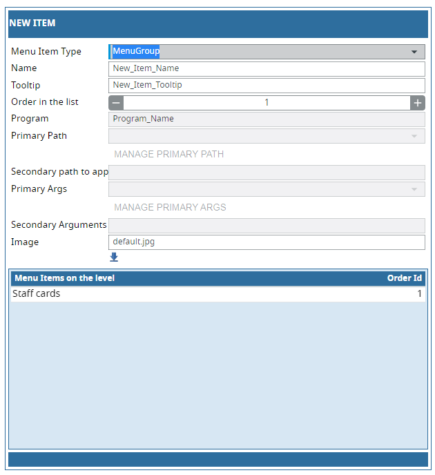 Order in the list defines item order on the current level. All menu items at the current level with their order numbers are shown in the table below.