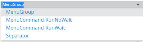 The Menu item type defines menu item: menu group, menu command runs applications WITHOUT waiting, menu command runs applications WITH waiting, separator(line/divider between menu items).