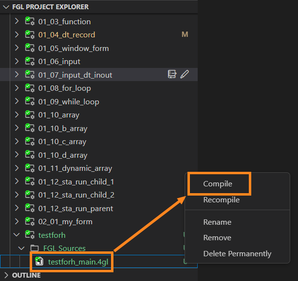 Step 1. Find the file in FGL Project Explorer, right-click it and select Recompile: